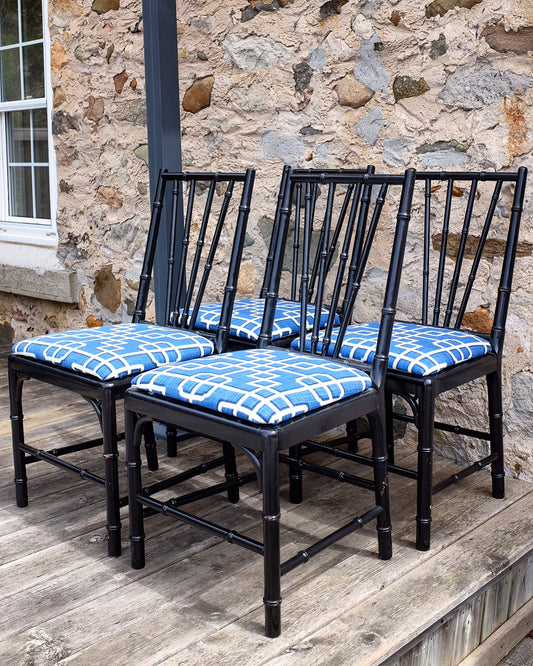 Black Lacquered Faux Bamboo Chairs with Trellis UpholsteryRegular price $500.00 CADRegular priceUnit price / per$0.00 CADSale price $500.00 CADSold out
