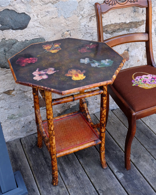 English Floral Top Octagonal Burnt Bamboo Table
